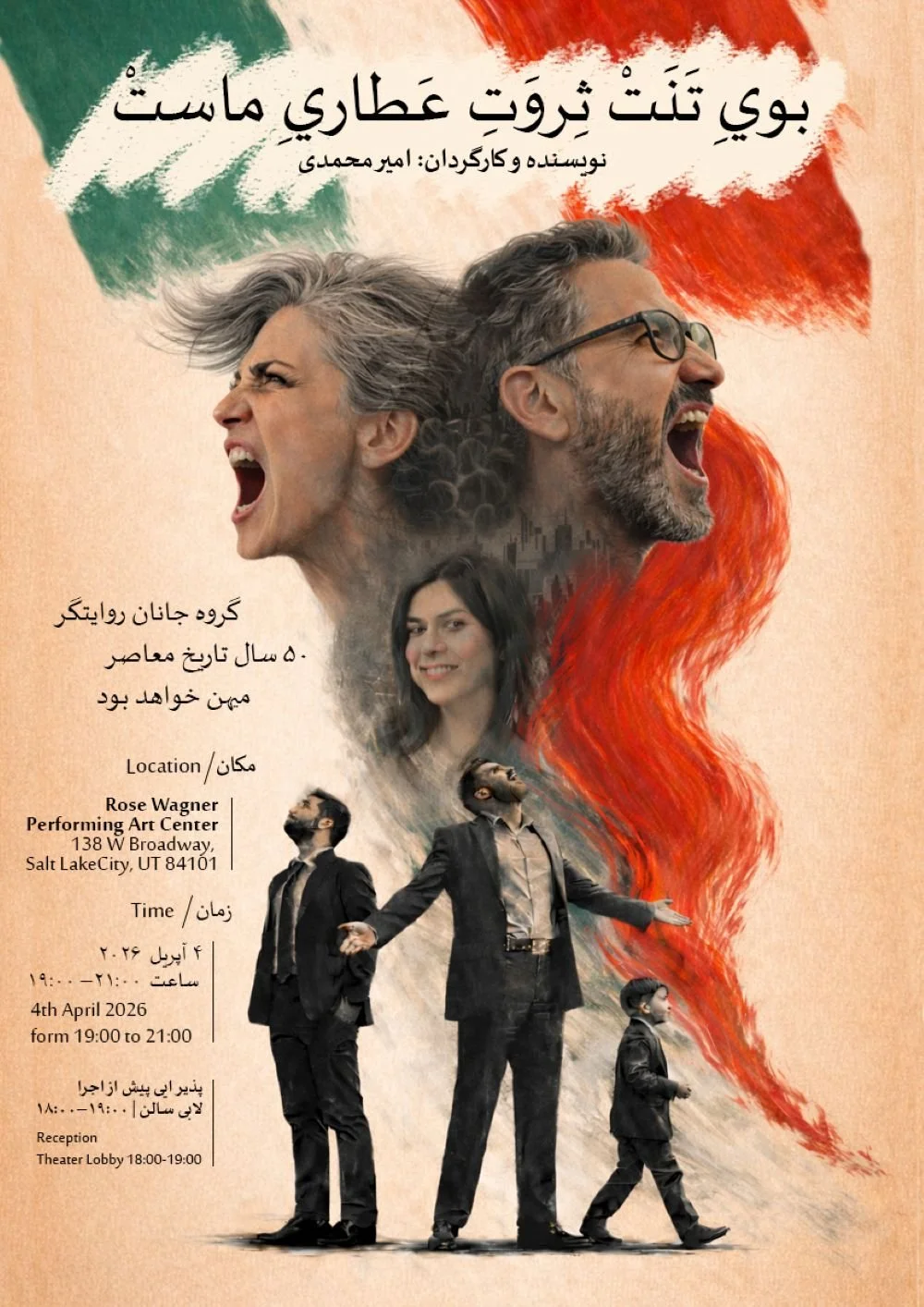 Timely and powerful, Booye Tanet Servate Attari Mast, follows a boy born in 1979-post-revolutionary Iran through present day. The work hopes to bring healing to the local Iranian community during a painful and conflicting moment. Performed in Farsi with English guide, Rose Wagner, 7pm.