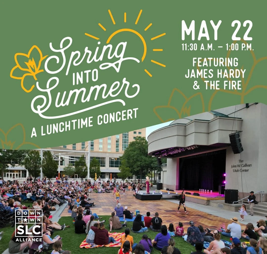 Let's Spring into Summer with food, music, and big downtown energy! Join us for a free lunchtime concert at Gallivan Center on Thursday, May 22, from 11:30 to 1pm. Purchase lunch from vendors of the Downtown Farmers Market, bask in the perfect weather, and enjoy a free concert from James Hardy and the Fire!